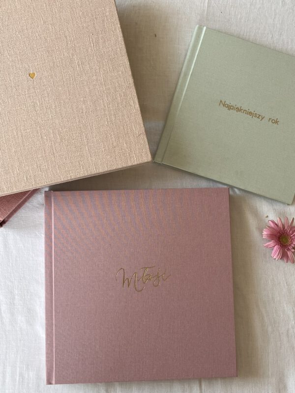 Okładkę wybieracie sami – spośród wielu kolorów, które wysyłam do wglądu. Każdy album zawiera złoty, personalizowany grawer na froncie i finalnie trafia do Was po wcześniejszym zatwierdzeniu projektu.